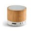 Bamboo speaker with microphone. 3.0 bluetooth transmission and a micro-USB port for charging. Battery with capacity up to 300 mmAh, autonomy up to 3 hours and 3W (4Ω) power. Features include call answering, volume control and connectivity to the mobile’s playlist. Includes a USB/micro USB charging cable and audio cable (Jack/Jack). Supplied in a kraft paper giftbox. ø60 x 52 mm