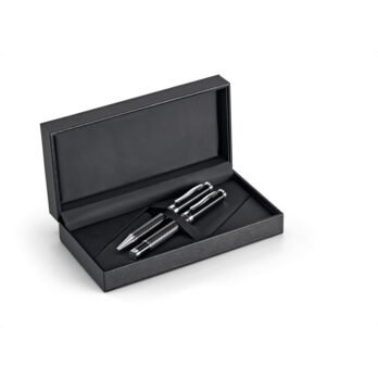 Set with a metal roller and ball pen. The roller writes in black and the ball pen with a twist mechanism writes in blue. Supplied in a cushioned gift case. ø13 x 135 mm | Box: 185 x 75 x 31 mm